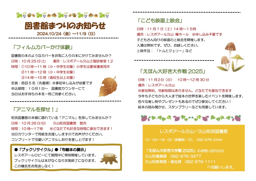 レスポアール久山で、秋の読書週間にあわせて、本との出会いを楽しめるイベント「図書館まつり」を開催します。