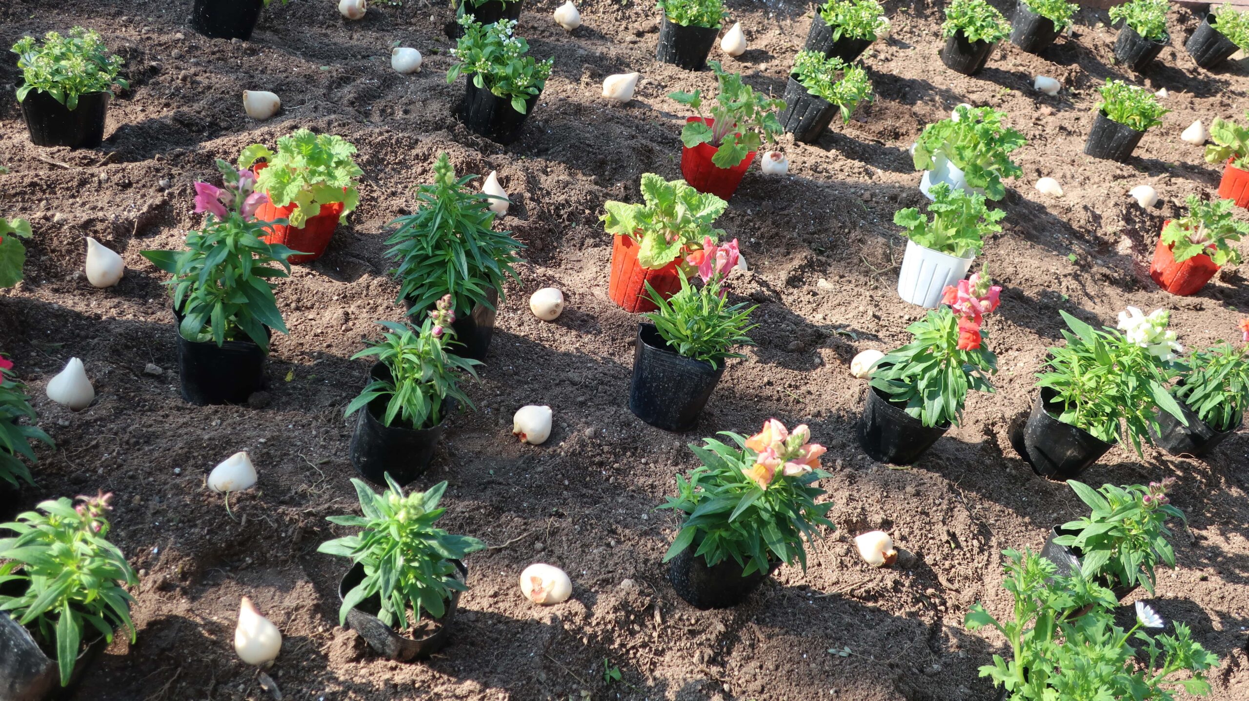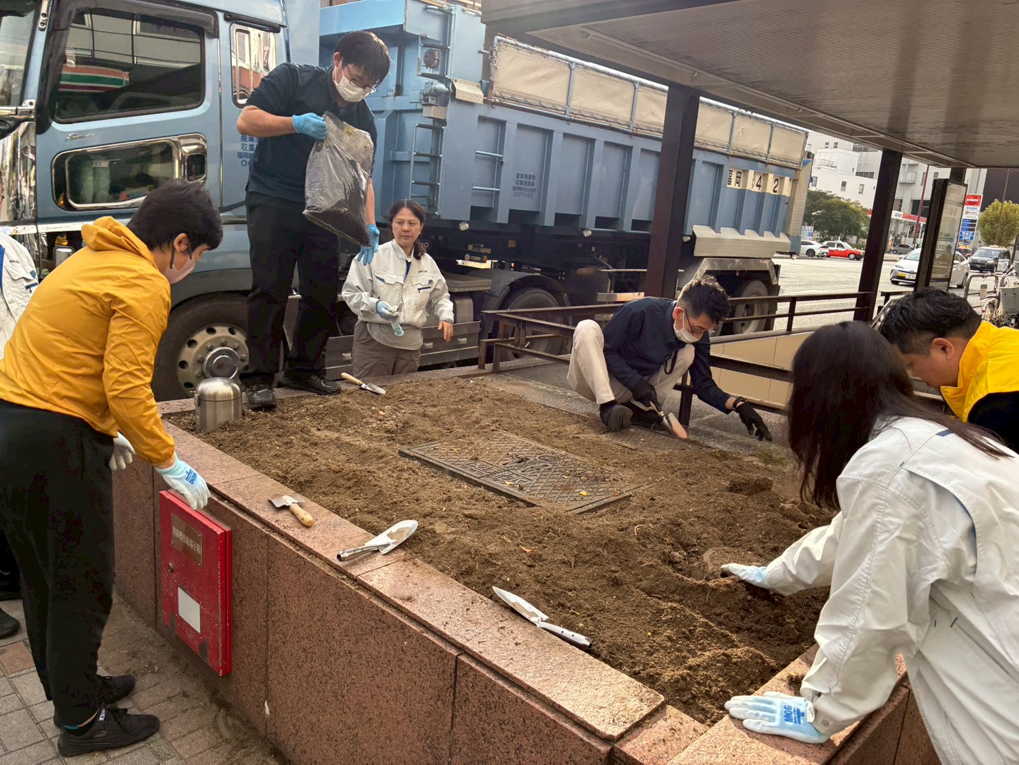 11月13日(木)に、土壌改良として草刈りと有機肥料の散布を実施し、翌14日(金)に花苗を植え付けました。