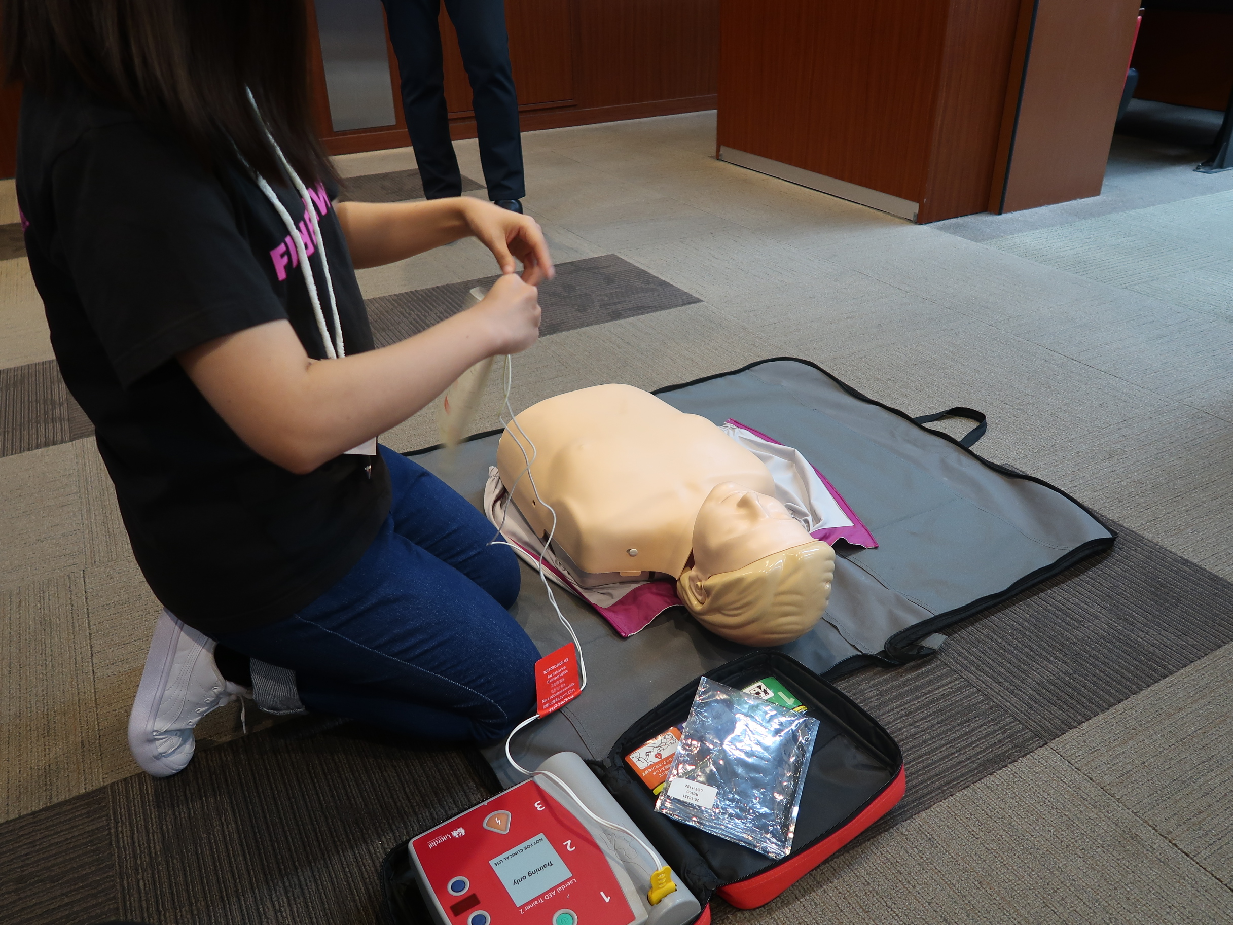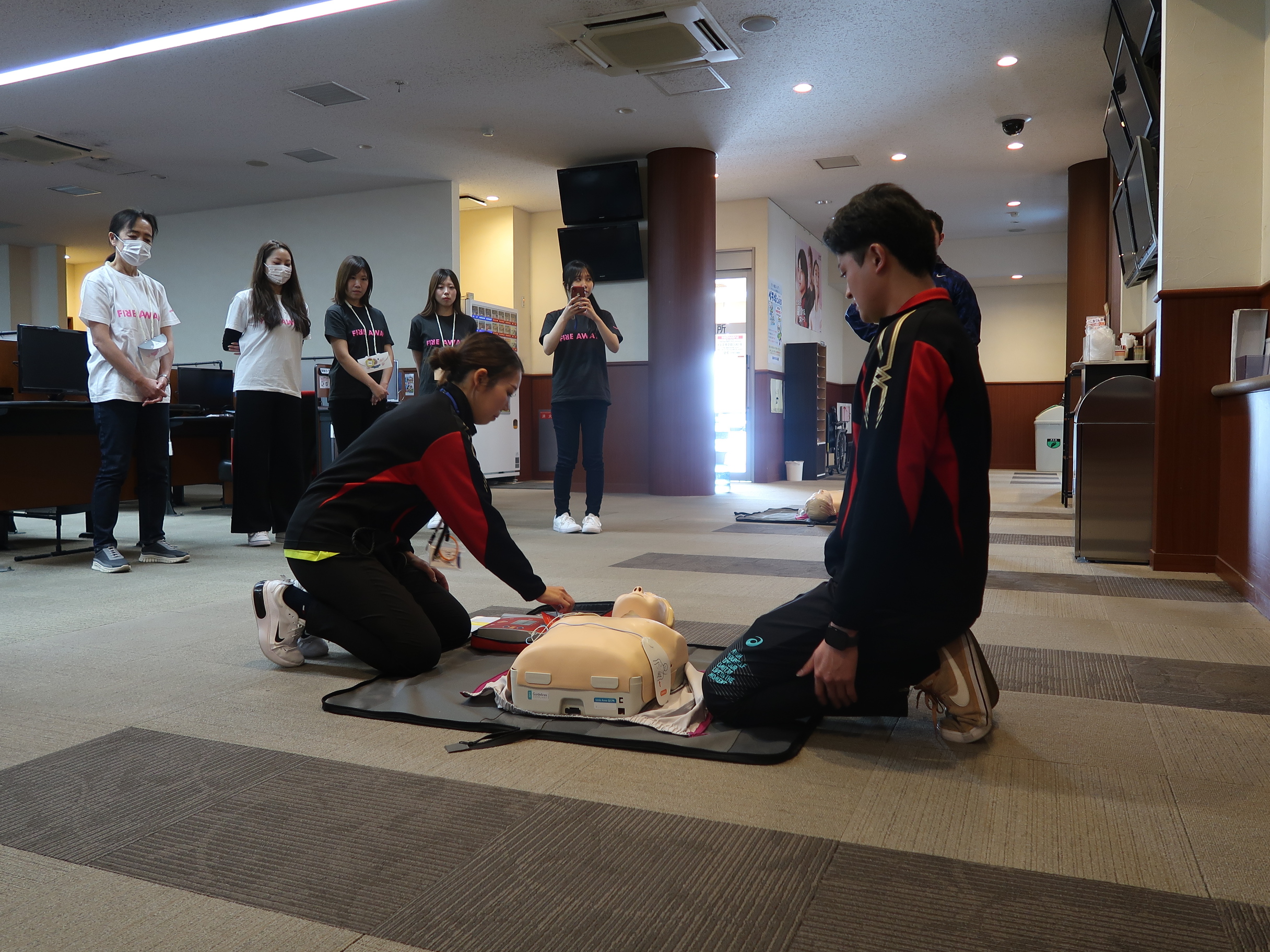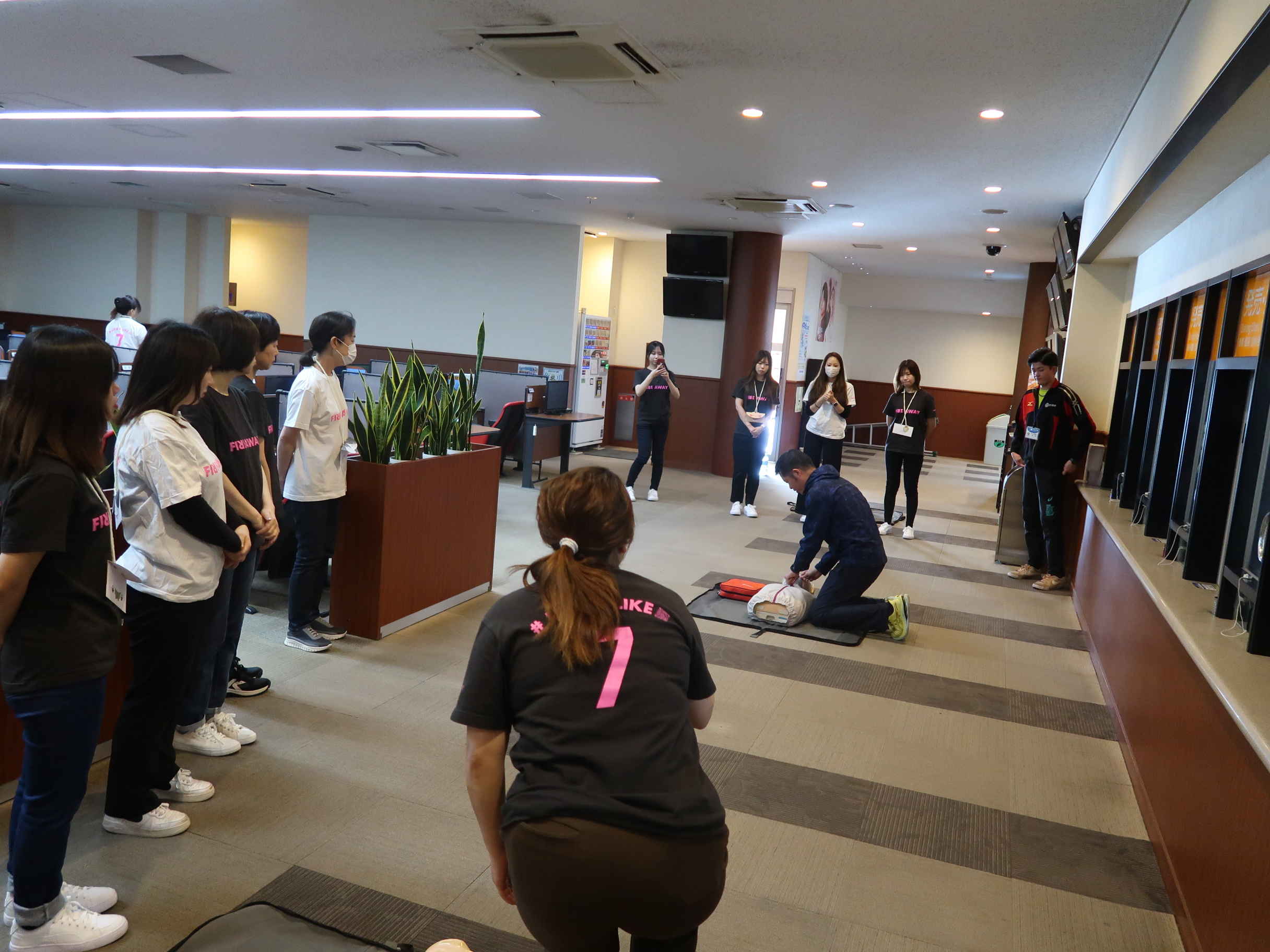 いざという時ためらわずに行動ができるよう応急手当の重要性、心肺蘇生法(胸骨圧迫・人工呼吸)、AEDの使用方法を指導しました。