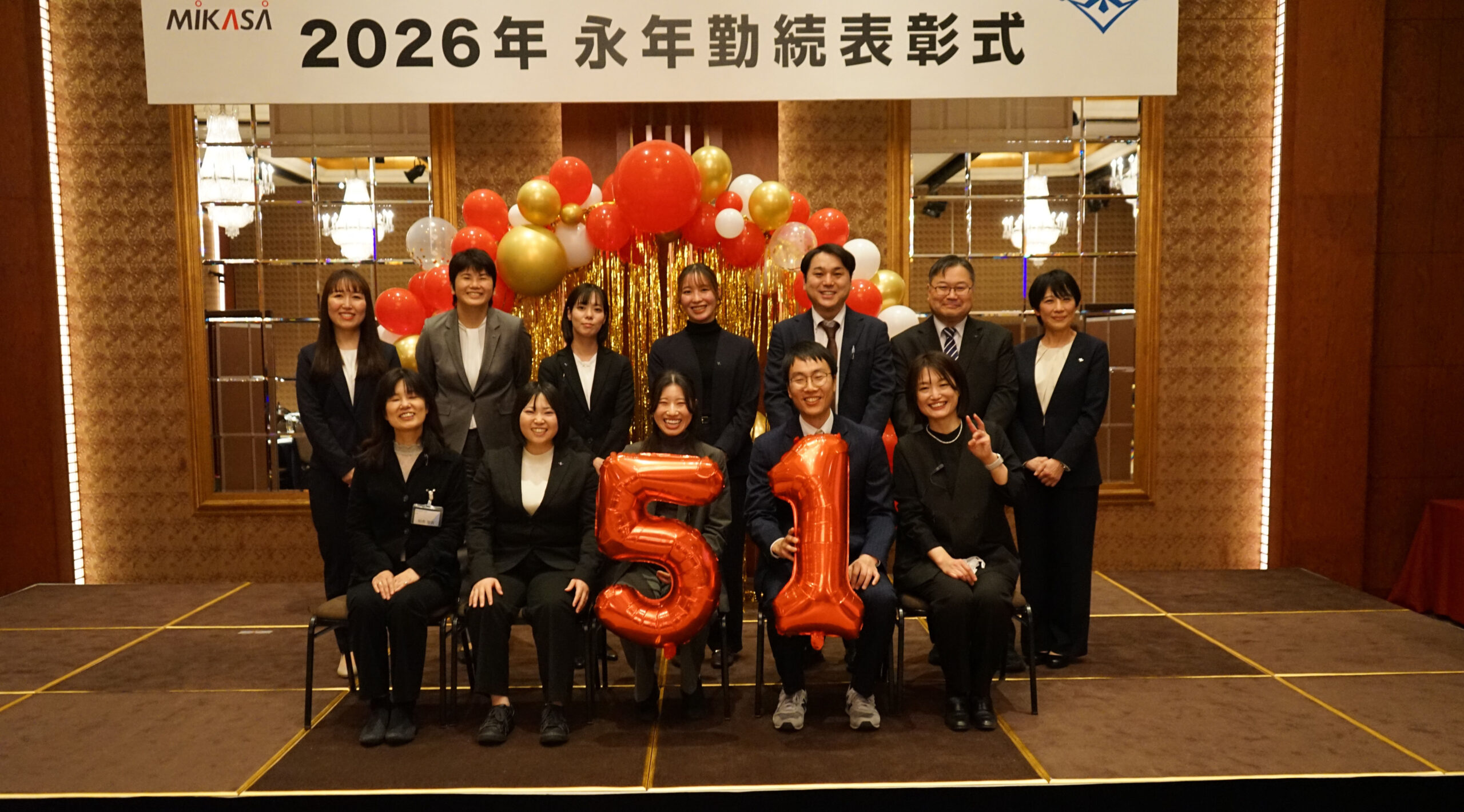 テーマに「NEXT 50 ~感謝の心で、未来へ~」を掲げた今回の永年勤続者表彰では、長年にわたりミカサの技術継承を支えてきた従業員の皆さんを表彰しました。